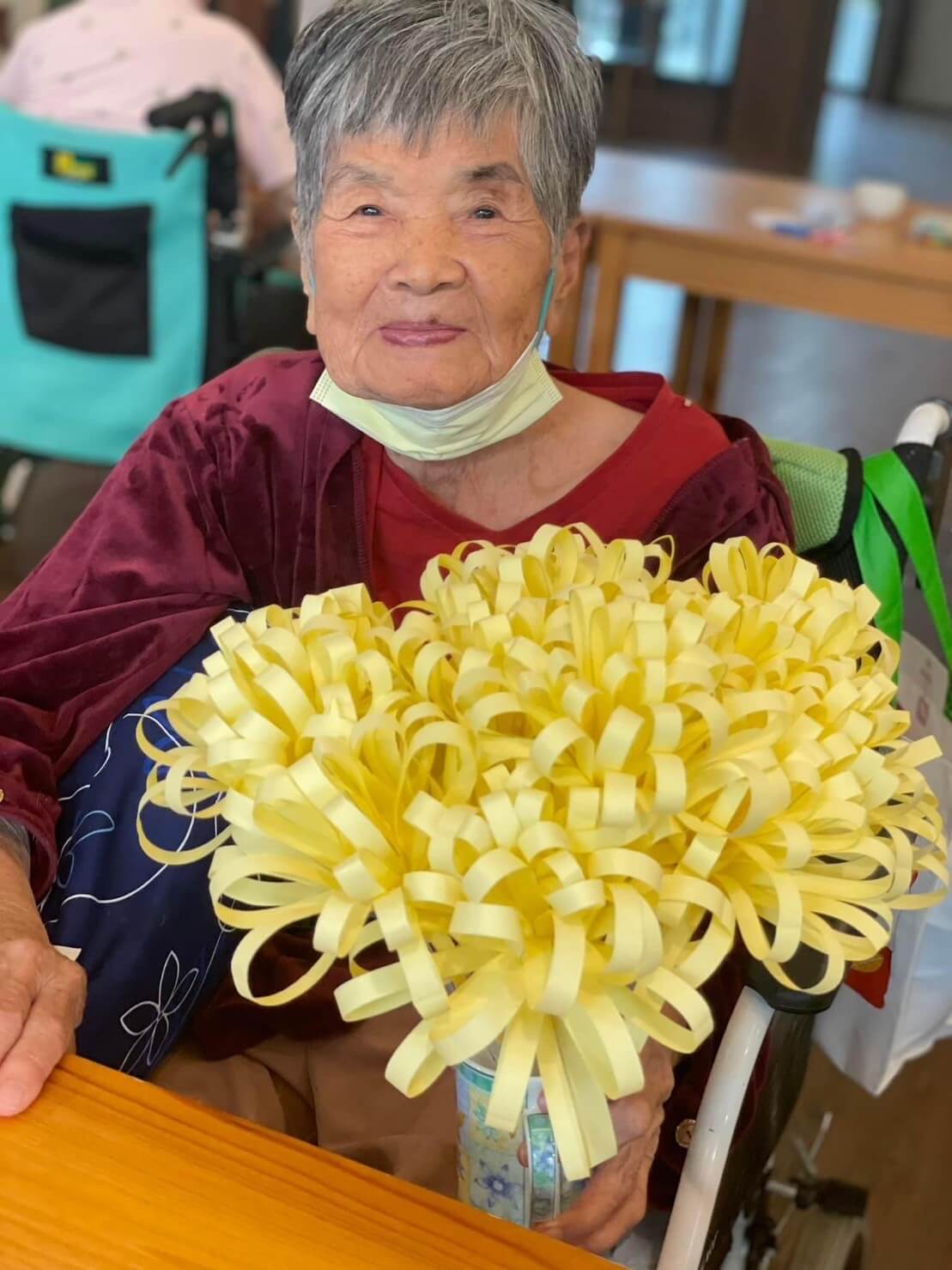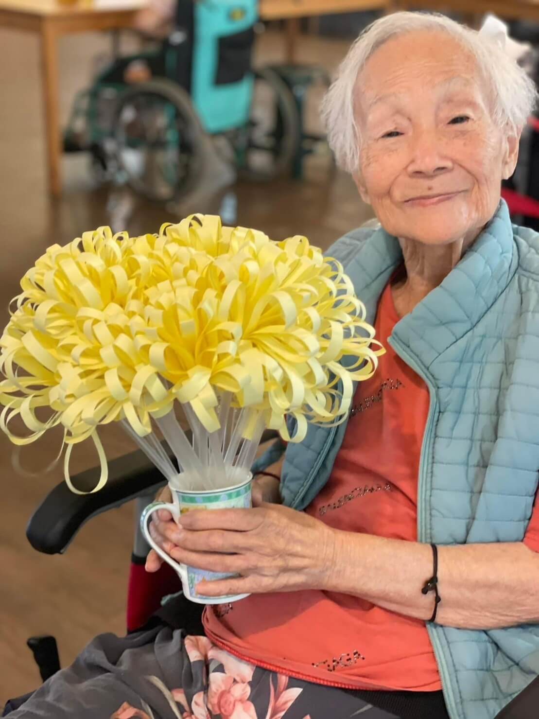 按習俗讓長輩品嚐菊花茶並手作菊花花束